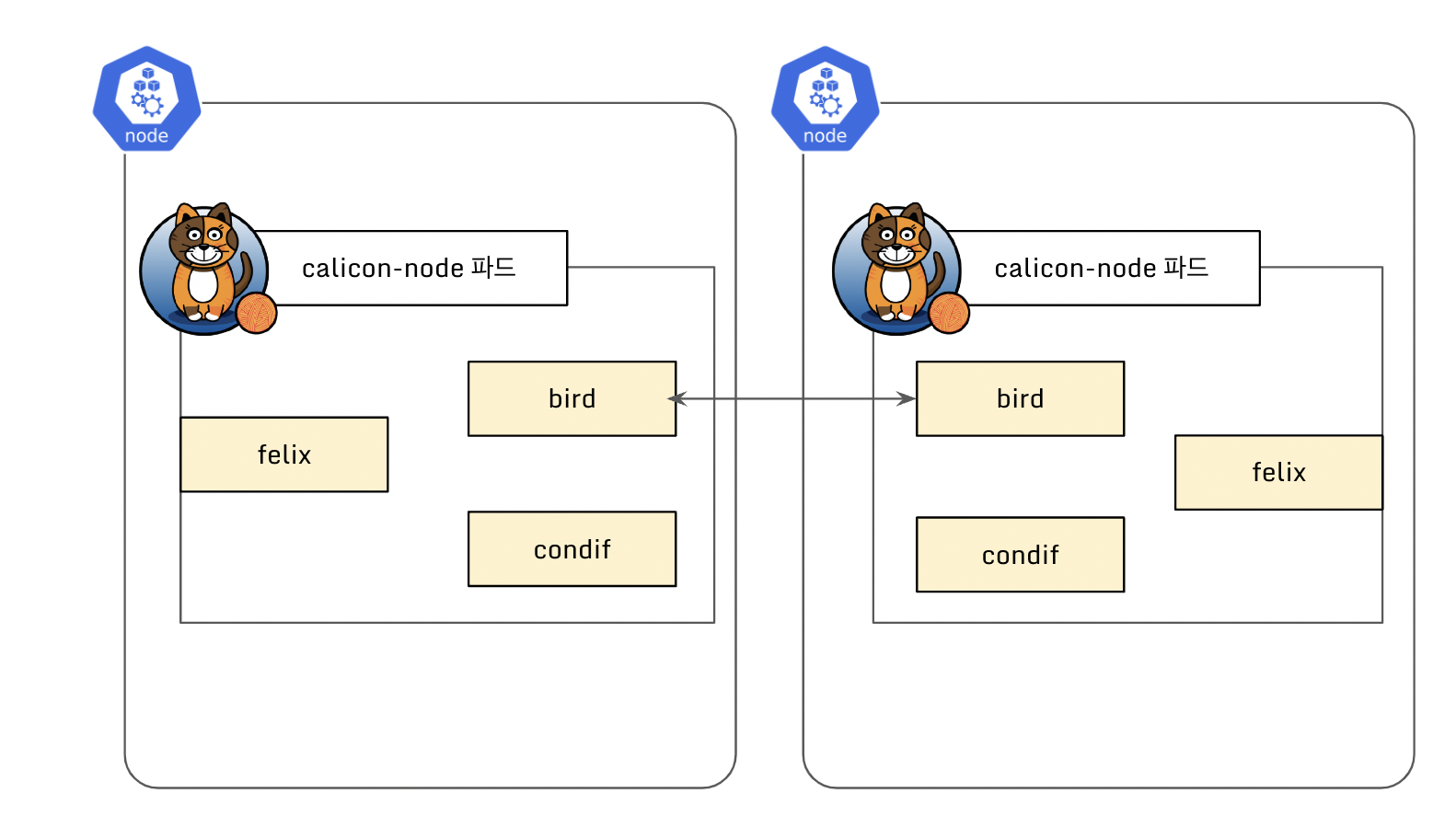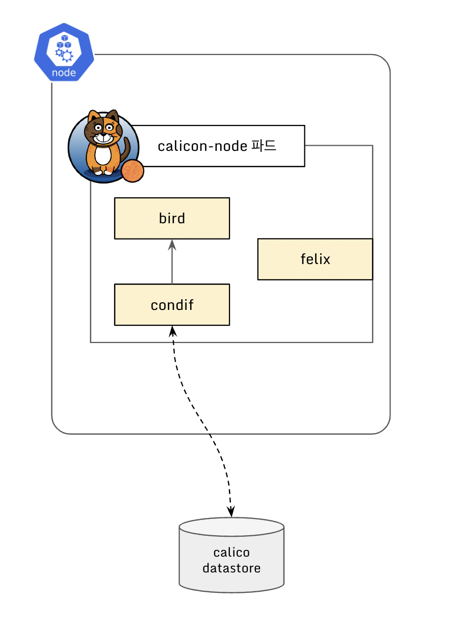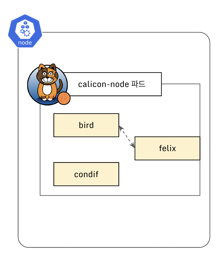 Calico CNI 설치시 Daemonset 으로 calico-node 파드가 생성됩니다. 이때, calico-node 파드에는 3가지(bird/felix/confd) 중요한 프로그램이 동작합니다.