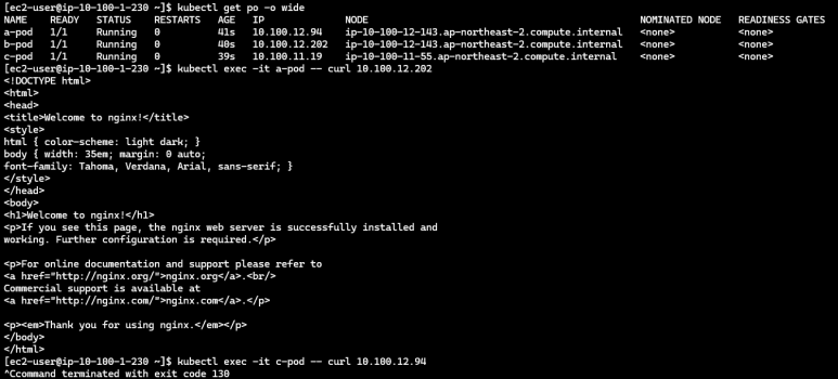 위 설정을 올바르게 했다면 아래의 사진과 같이 a → b 파드로는 통신이 되는것을 확인 할 수 있으며 c → a 파드에서의 통신은 안되는 것을 볼 수있습니다.