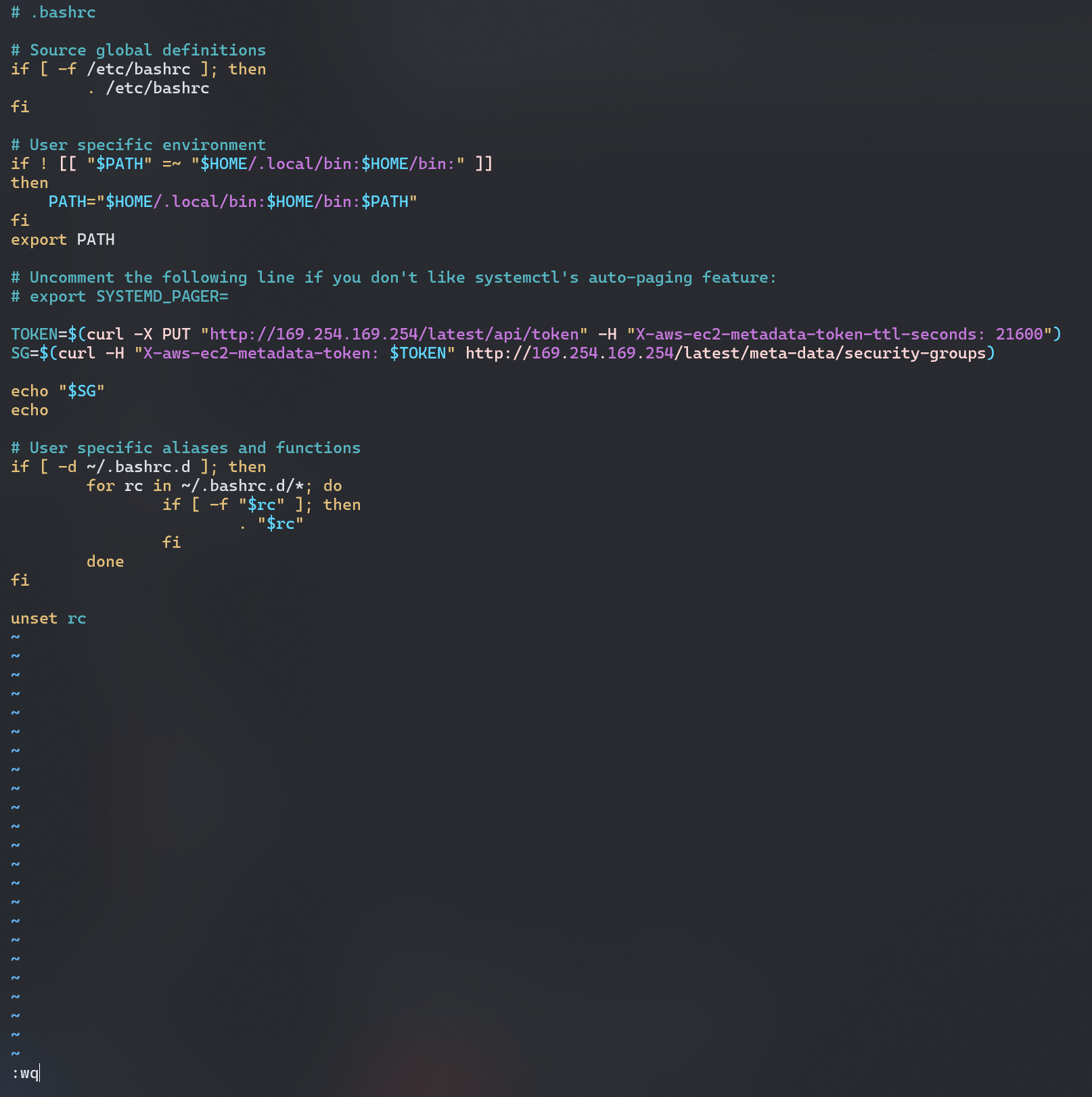 bashrc에 접속 후 IMDS 명령어 입력 후 저장 종료
